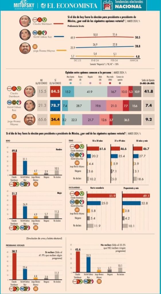La encuesta nacional mensual de marzo “Tendencias electorales rumbo al 2 de junio 2024” levantada por Consulta Mitofsky en viviendas con urna y boleta electoral simuladas, revela una “preferencia bruta” de casi dos a uno ya que cinco de cada 10 electores (50.5%) aseguró que votará por la candidata de Morena, PT y PVEM a la Presidencia de la República, mientras que casi 30 de cada 100 (28.8%) dijo que lo hará por la contendiente presidencial del PAN, PRI y PRD; 4.8% respondió que sufragará por el emecista.